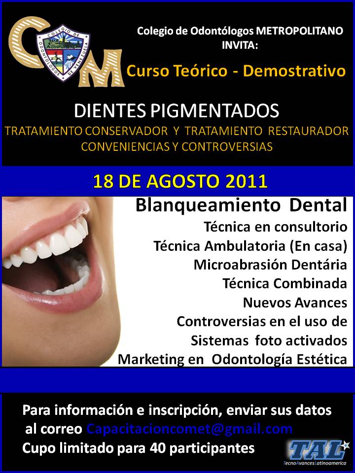 A petición de nuestros agremiados y con el apoyo institucional de TecnoAvancesLatinoamerica (TAL®), se inician los cursos de Verano en la modalidad Teórico-demostrativo y Teórico-Práctico. En esta oportunidad el tema a tratar será sobre los DIENTES PIGMENTADOS, este curso estará dividido en dos módulos independientes. BLANQUEAMIENTO